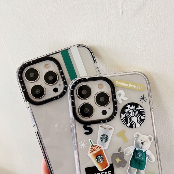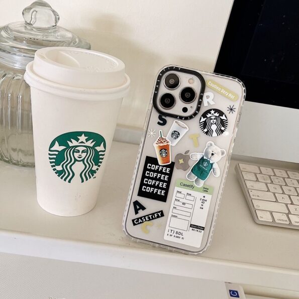 This transparent case is decorated with 3D-effect Starbucks-themed stickers like the iconic bear, coffee cups, and logo, giving your iPhone a trendy, aesthetic vibe. Made from premium shockproof TPU material, it provides full protection against drops, scratches, and daily wear while keeping your phone slim and lightweight.