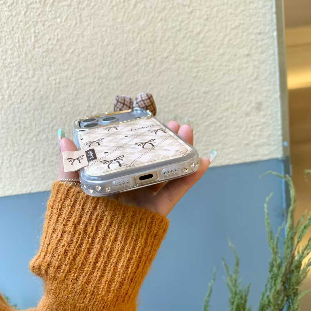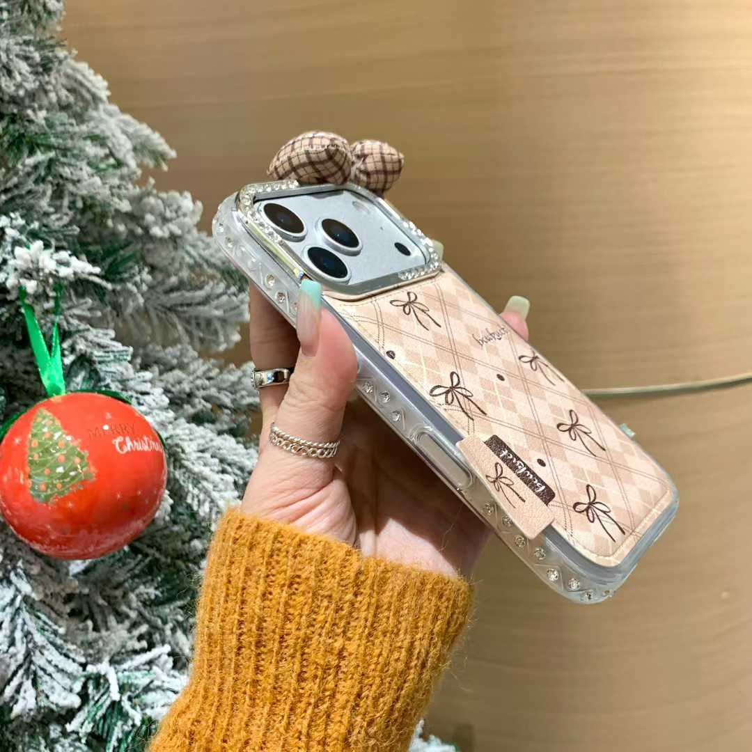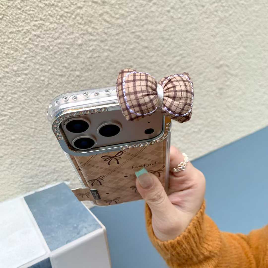 Upgrade your phone’s look with this Beige Checkered Bow iPhone Case, designed for lovers of soft, elegant, and aesthetic styles. Featuring a classic plaid pattern with delicate bow prints, this case is enhanced with a 3D fabric bow detail and a sparkling rhinestone camera frame for a premium, fashionable touch.