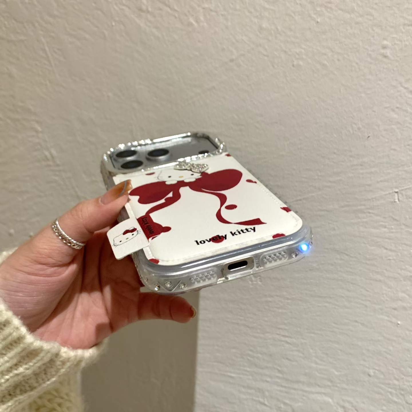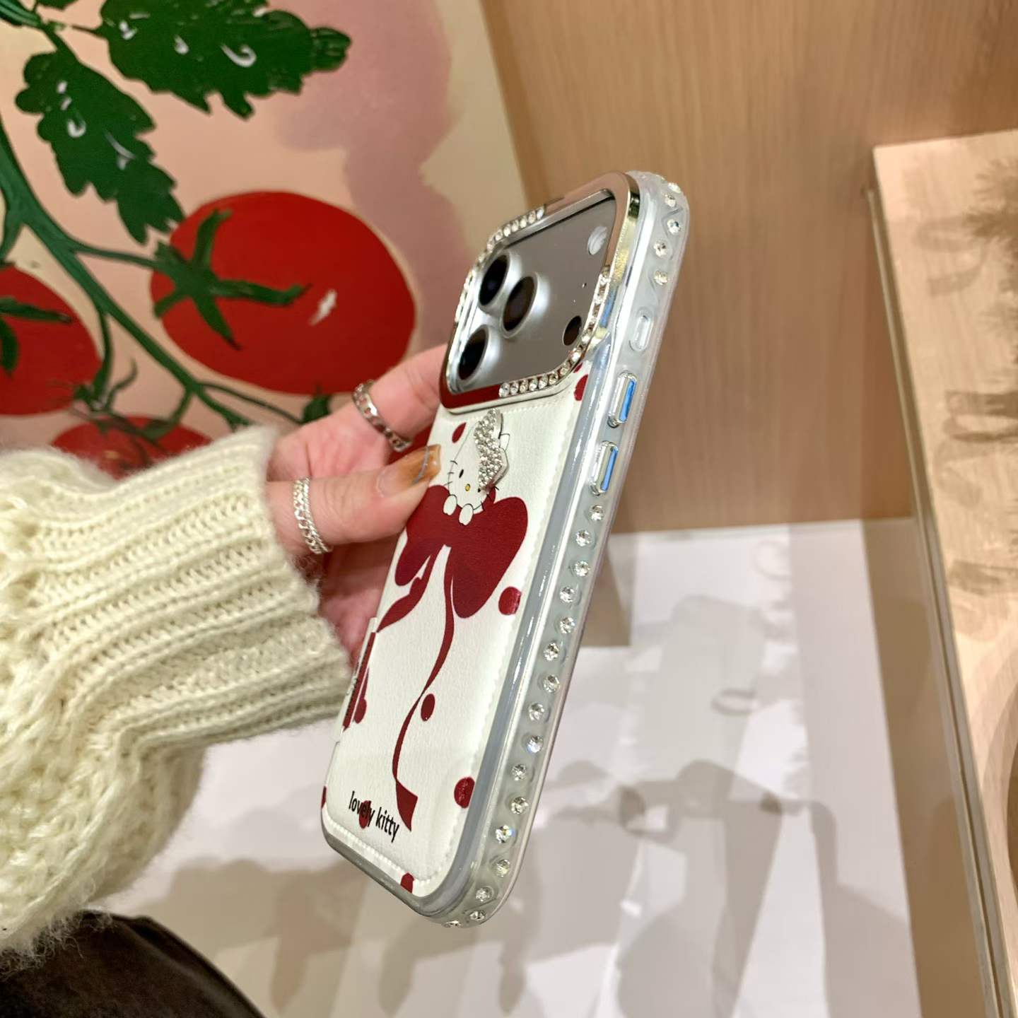 This cute bow kitty back cover is compatible with iPhone models and designed for users who love elegant, girly aesthetics with daily practicality. The case features a charming kitty illustration with a large bow design on a premium textured finish. A built-in card holder allows easy storage of cards or IDs, while the rhinestone-lined camera frame adds both sparkle and extra lens protection. The soft yet durable material offers a comfortable grip and reliable everyday protection.