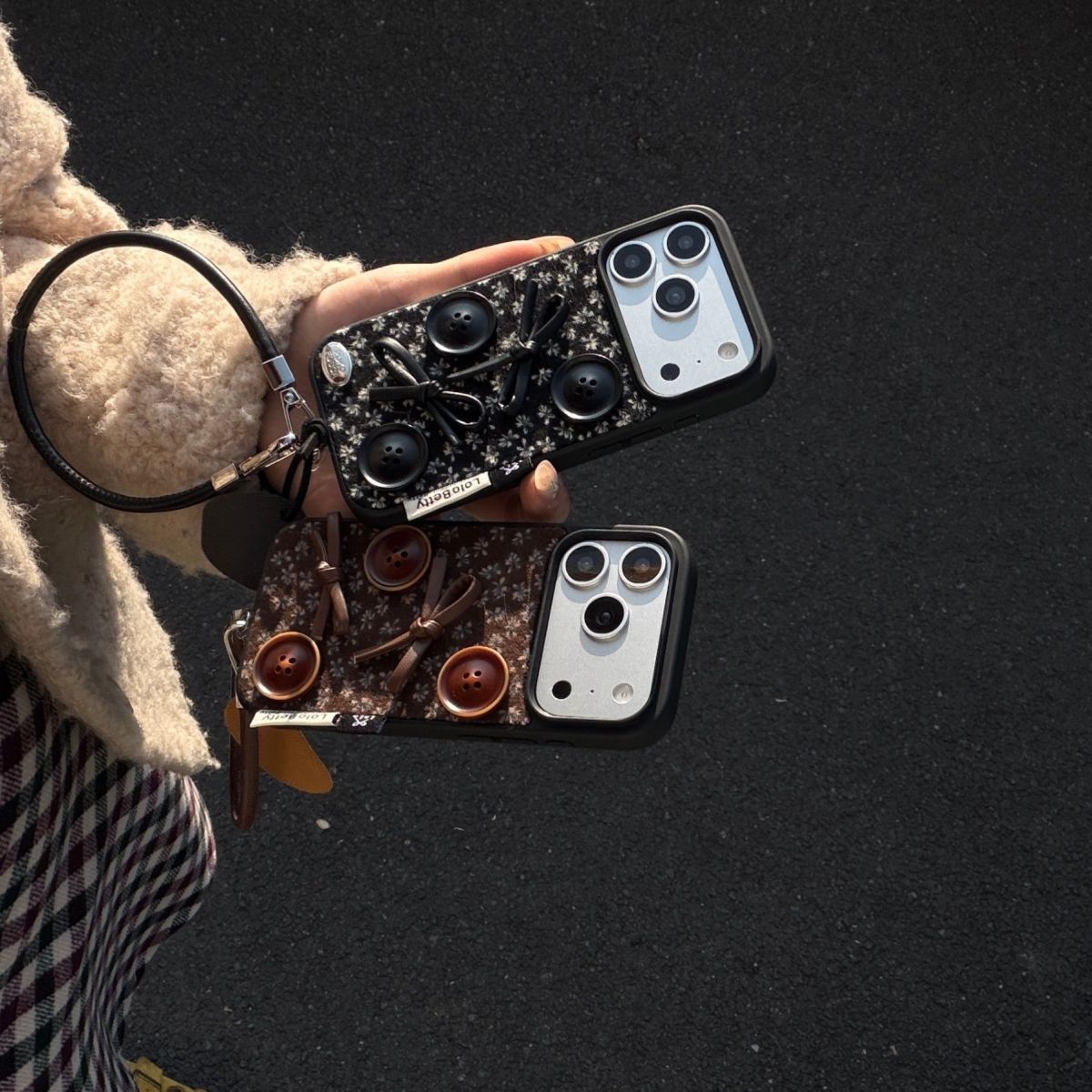This iPhone back cover features a fabric finish with a button-style design and a small bow detail on the back. The case comes with a wrist strap that makes it easy to carry and helps prevent accidental drops. It is slim and lightweight, making it comfortable for daily use. The cover protects the phone from scratches, dust, and minor drops. Raised edges around the camera and screen provide extra protection. Precise cut-outs ensure smooth access to all buttons, ports, and the camera. Suitable for regular everyday use.
