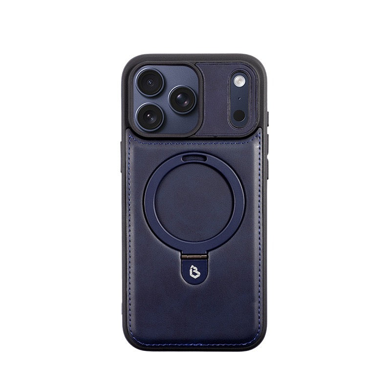 This case features a rich green leather-texture finish combined with a magnetic ring stand for added convenience. The built-in stand allows easy hands-free viewing, while the magnetic ring supports MagSafe-compatible accessories. The case has reinforced edges for everyday drop protection and a raised frame around the camera to help guard the lenses. Designed with a smooth grip and a stylish finish, it offers both functionality and a refined appearance for daily use.