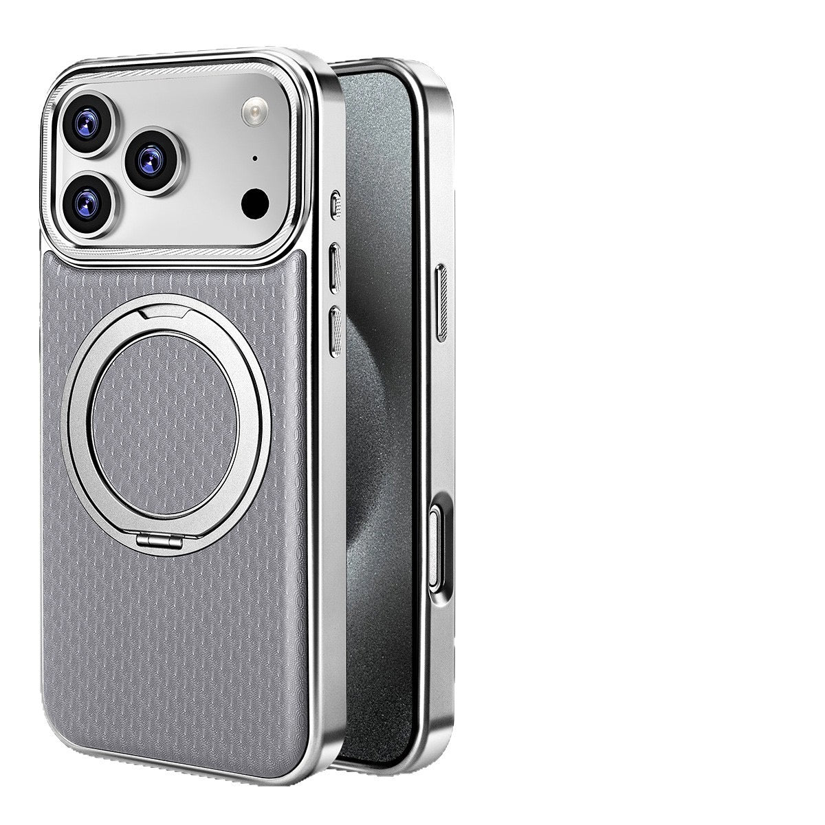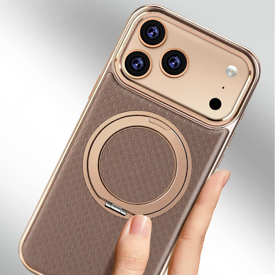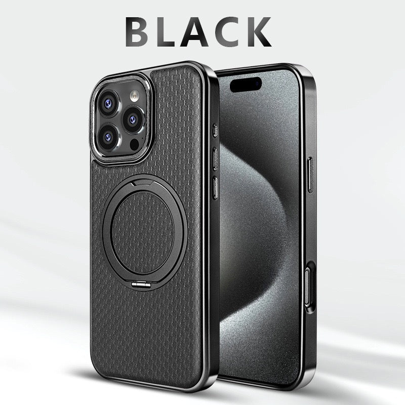 This iPhone case comes with a built-in magnetic ring for MagSafe charging and a 360° rotating stand for hands-free use. The textured back provides a steady grip, while the metal bracket adds durability. The raised frame around the camera helps protect the lenses from scratches. Slim, sturdy, and easy to hold, this case is designed for everyday protection and convenient viewing.