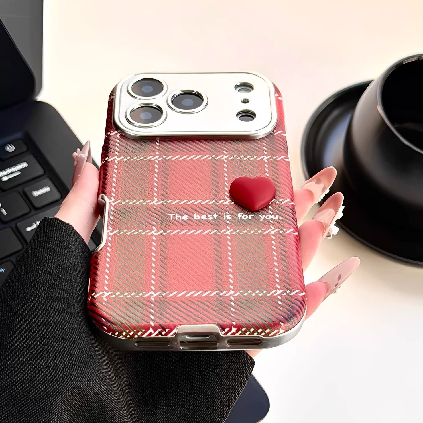 This phone case features a classic red checkered pattern with a soft heart detail and printed message, giving your phone a modern and elegant look. The matte-textured surface provides a comfortable grip and helps reduce fingerprints. Made from durable and flexible material, the case protects your phone from scratches, dust, and minor drops. The raised camera and screen edges add extra safety, while the slim design ensures easy daily use.